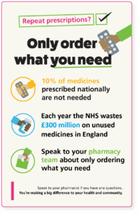 - Keep track of what medication you’re taking – don’t continue to order medicines you are no longer taking or where you have lots at home.